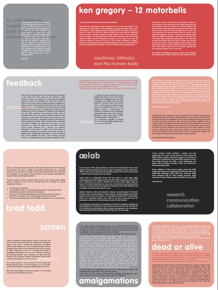 Gregory’s 12 Motor Bells is a computer-controlled electromechanical audio installation where microprocessor technology, machines, intimacy and the human body collide.
