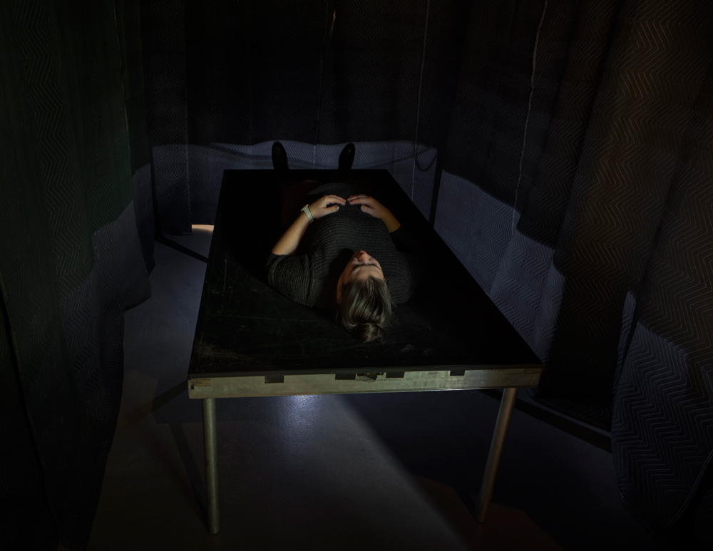 A dark room designed for blackness, tactile sound, the bones, muscles and nerve network in the body. It’s a way to get in contact with inner & outer space, death and the sensuous. The room is an installation where people interact with spatial cues and intimacy while lying down on an elevated platform. This work is concerned with direct and swift transduction of the sound program to different sensorial zones of the body, mechanical transmission without airborne audio transmission. A sound massage from the chthonic.