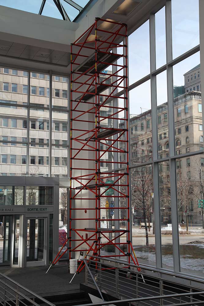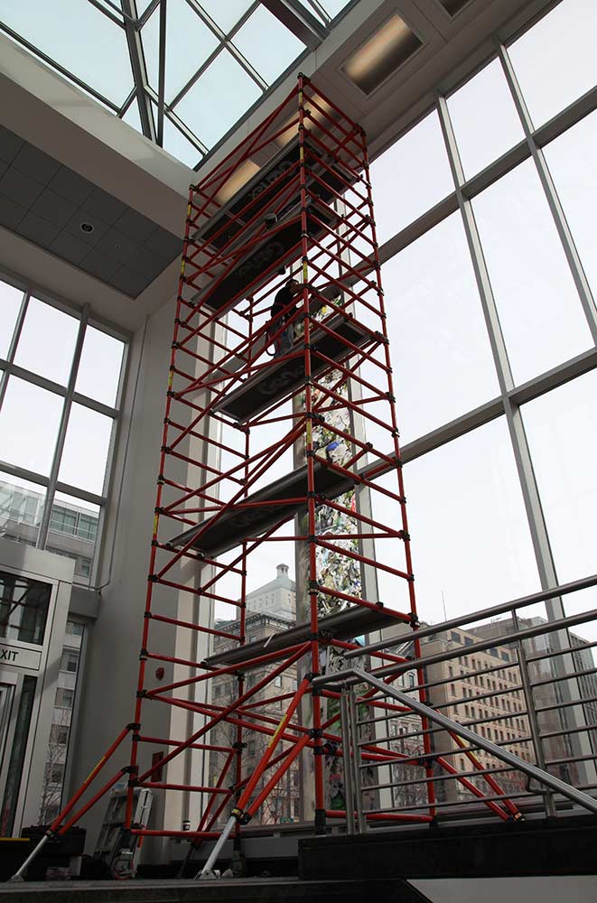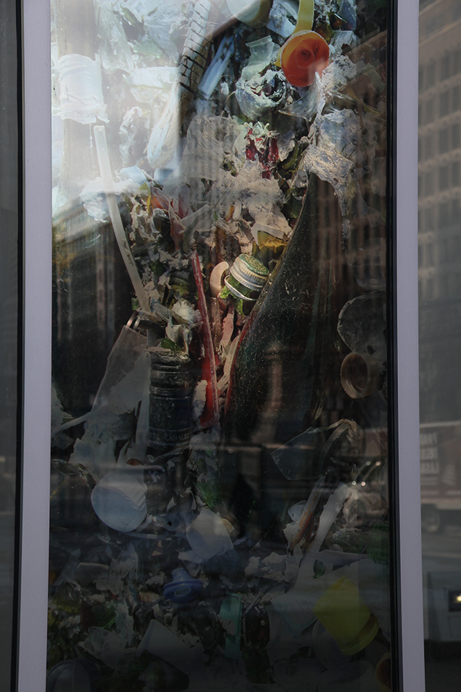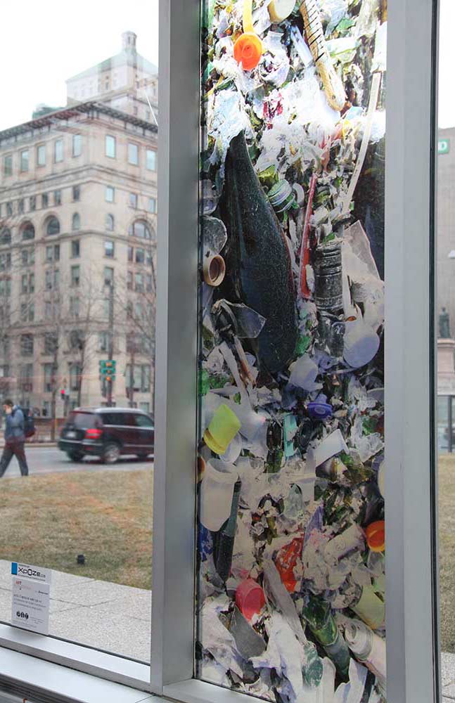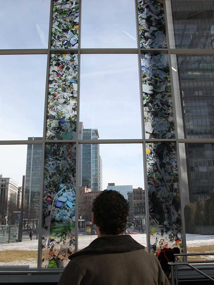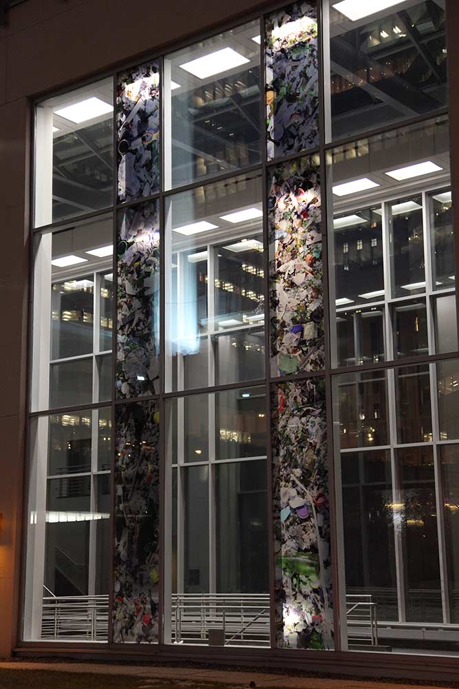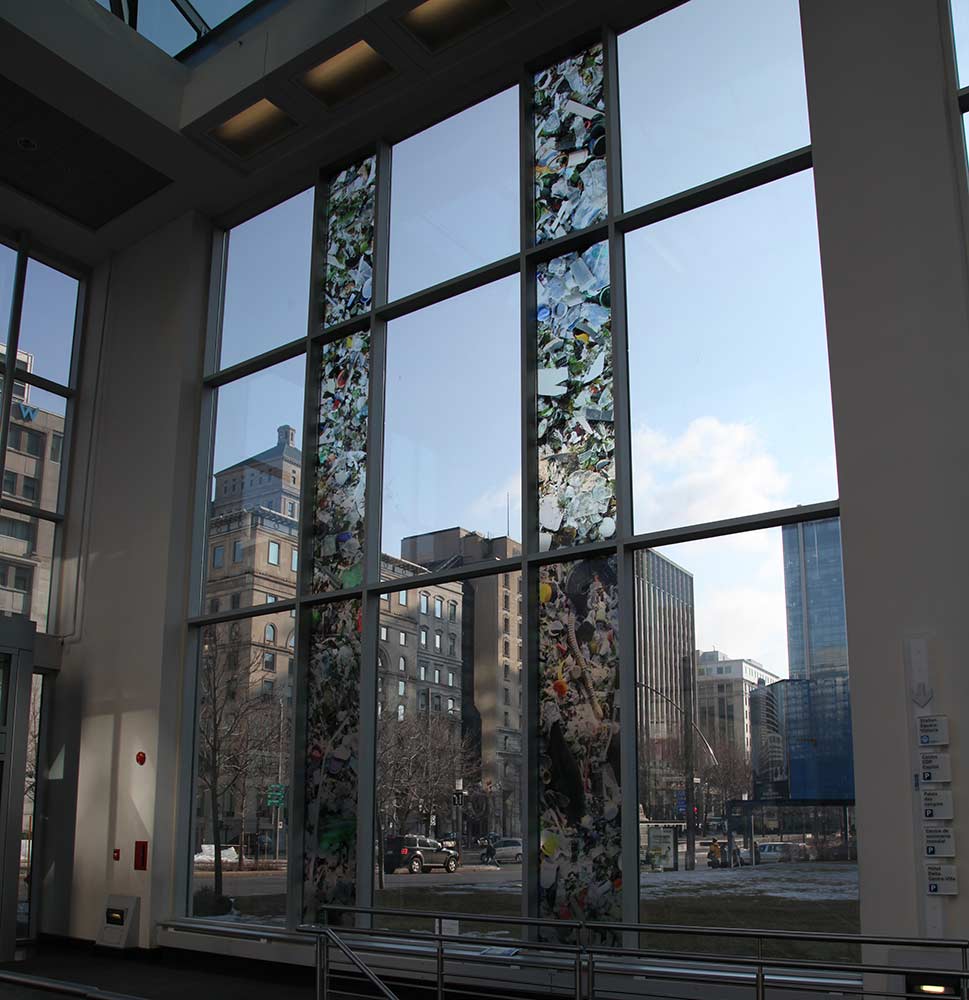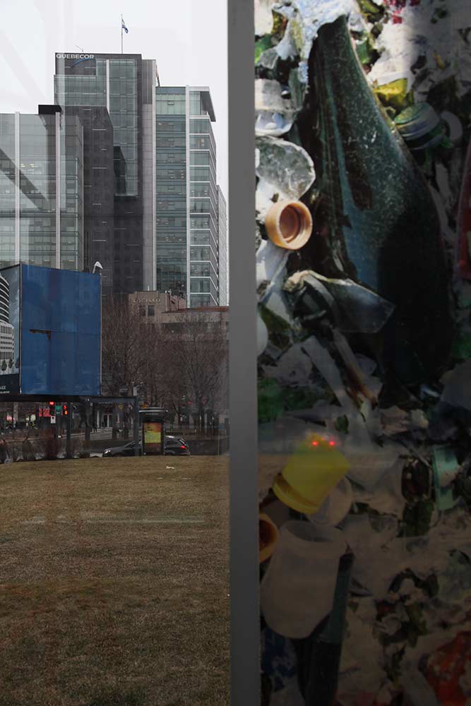Deux territoires – le centre de commerce mondial de Montréal et le lieu d’enfouissement de déchets (LET) de Lachenaie (Qc) – sont associés. Une pellicule photographique diaphane est ajoutée à un espace architectural de passage et par la même occasion relie les aspects visibles et invisibles du déchet en amenant les opérations du LET en plein centre-ville. L’écologie est agencée à l’économie. Le projet les inscrit dans le réel par l’action d’un découpage visuel intégré à l’architecture vitrée, visible le jour et la nuit, de l’intérieur comme de l’extérieur.