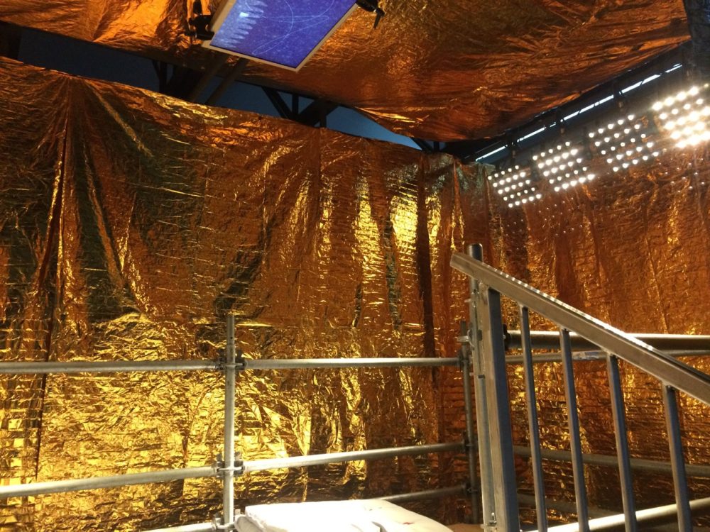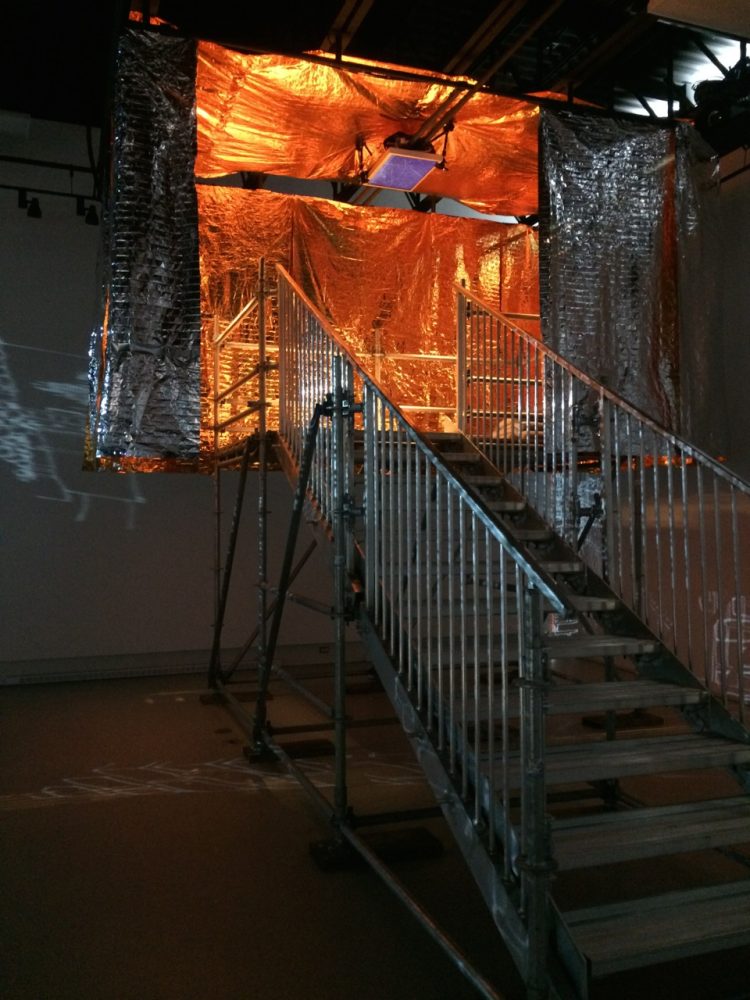 Grâce à un processus d’échantillonnage d’images de la nébuleuse Messier 5, le mouvement d’une ligne orbitale trace la luminosité des étoiles pour générer une captivante chorégraphie sans cesse renouvelée avec les lumières DEL. Celles-ci scintillent sur une membrane plissée réfléchissante, venant elle aussi de la recherche spatiale. Une expérience contemplative de lueurs dorées qui rythment des expériences nouvelles de l’espace.