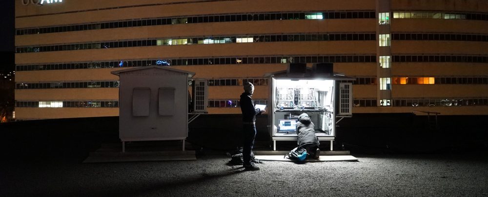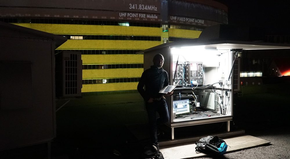 IRRADIER. IRRADIATE est une projection qui puise des fréquences électromagnétiques (EMF) invisibles et inaudibles parmi lesquelles vont et viennent quotidiennement les êtres vivants. Les visualisations EMF sont générées en direct, à l’aide d’un logiciel libre (Gqrx-SDR), d’un anémomètre et d’une antenne, pour rendre l’intensification et la densification des signaux de communication sans fil dans des cadres urbains. Avec son format monumental, ses couleurs minimalistes et ses lignes vibrantes, ce panorama de bruit-à-signal transmet aux citadins un sentiment d’immersion et les nouvelles formes de radiation non consenties comme modalités de pollution. Irradiées – exposées, traitées et illuminées – par et dans des machines, elles co-constituent alors des vibrations corporelles.