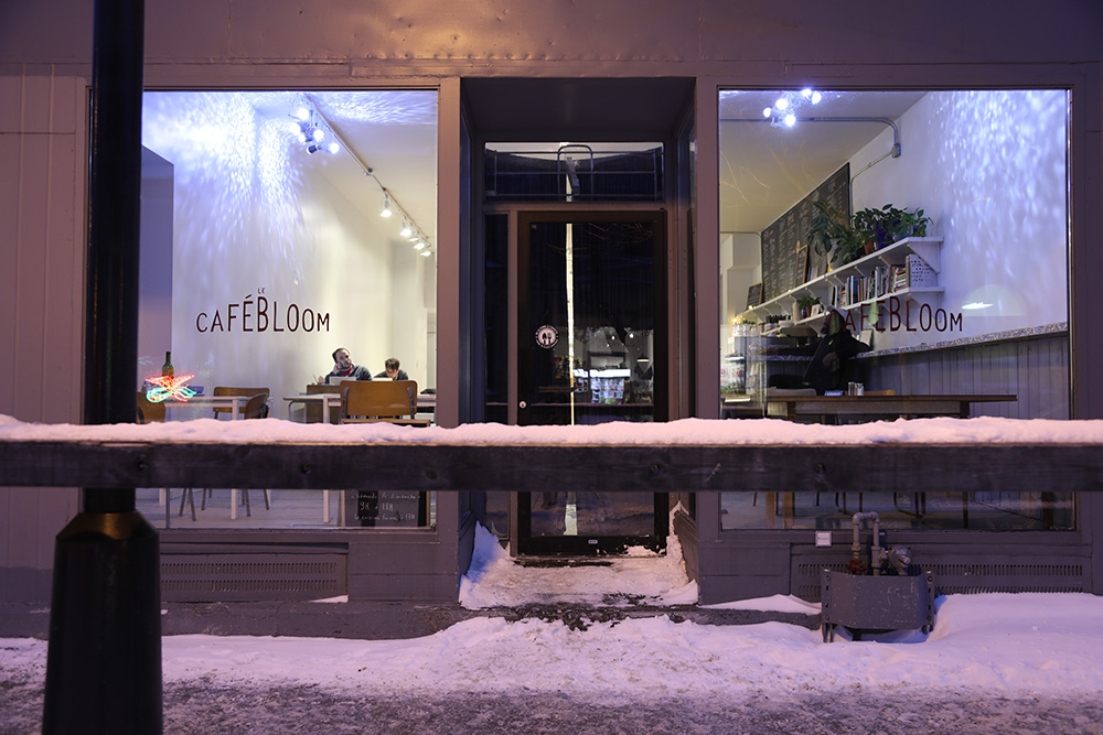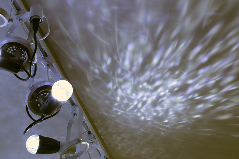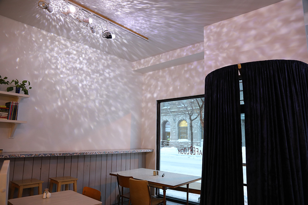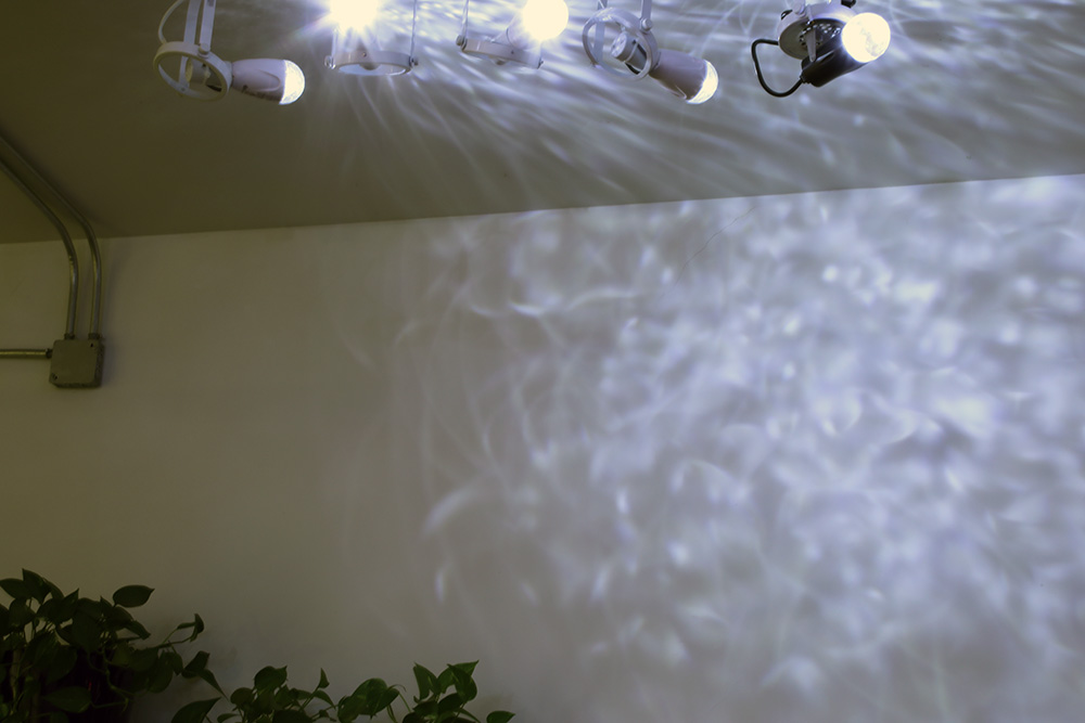 At the Café Bloom in Pointe-St-Charles, Caroline Andrieux (Artistic Director of the Darling Foundry) has invited artists to exhibit for the last three years. In this context, Trudel created the first light installation in the window. The installation consists of adapting the track-light sockets with LED bulbs which create interference between animated pattern of glittering light.