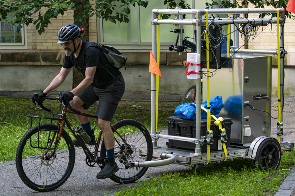 It is presented in a tubular structure placed on a bicycle trailer that can be moved with a team of cyclists. It can be equipped with a monitor, LED tile, projector, sensors, loudspeakers, computer, transport boxes, mobile energy unit, solar panel, parasol, etc. When it is in a temporary fixed position, the activities and associated configurations are of variable nature and duration: meetings, reading circles, data collection, sound performances, presentation of works, demos or workshops, film screenings, etc.